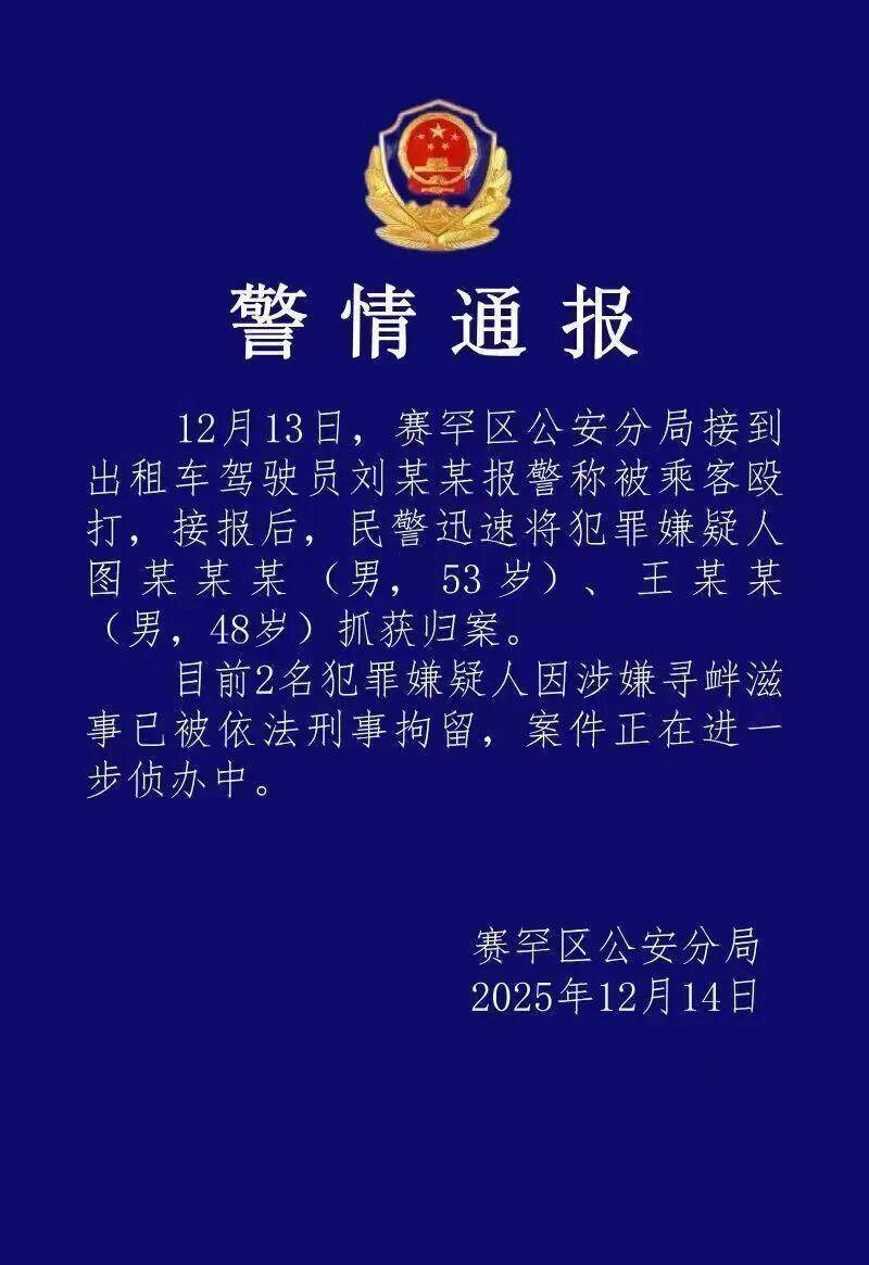 视频画面。相关视频显示,12月13日2时,两名男子和一名女子同乘一辆出租车。两名男子不断对出租车司机进行殴打,并谩骂侮辱,抢夺司机手机。其间,车上女子试图劝阻,并称“人家怎么了?”12月14日,呼和浩特市公安局赛罕区分局工作人员向南都记者表示,“该事件正在侦办中,已发布相关警情通报。”警情通报12月13日,赛罕区公安分局接到出租车驾驶员刘某某报警称被乘客殴打,接报后,民警迅速将犯罪嫌疑人图某某某(男,53岁)、王某某(男,48岁)抓获归案。目前,2名犯罪嫌疑人因涉嫌寻衅滋事已被依法刑事拘留,案件正在进一步侦办中。