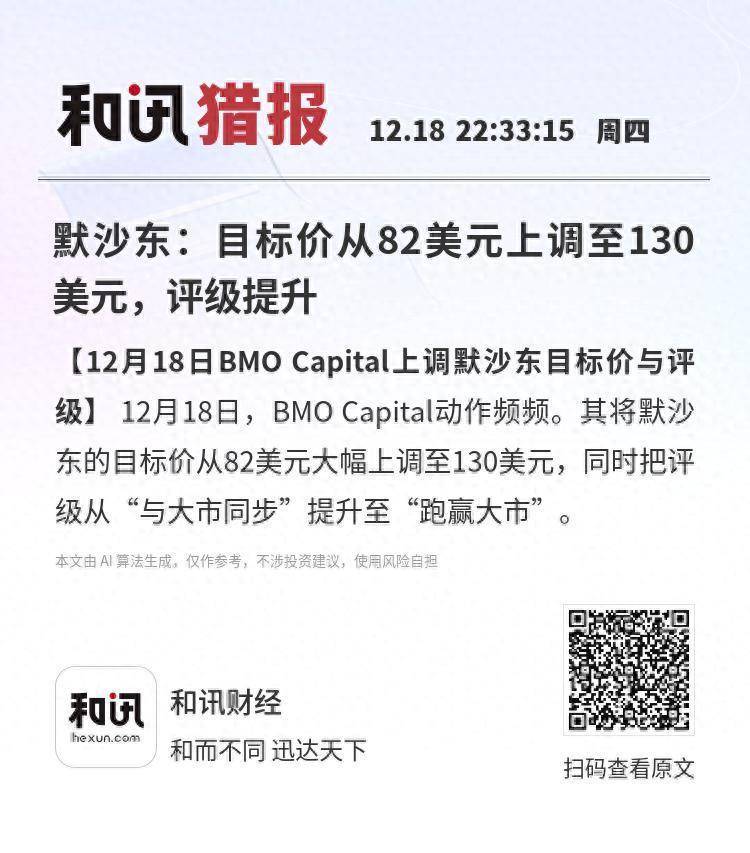 【12月18日BMO Capital上调默沙东目标价与评级】12月18日,BMO Capital动作频频。其将默沙东的目标价从82美元大幅上调至130美元,同时把评级从“与大市同步”提升至“跑赢大市”。
